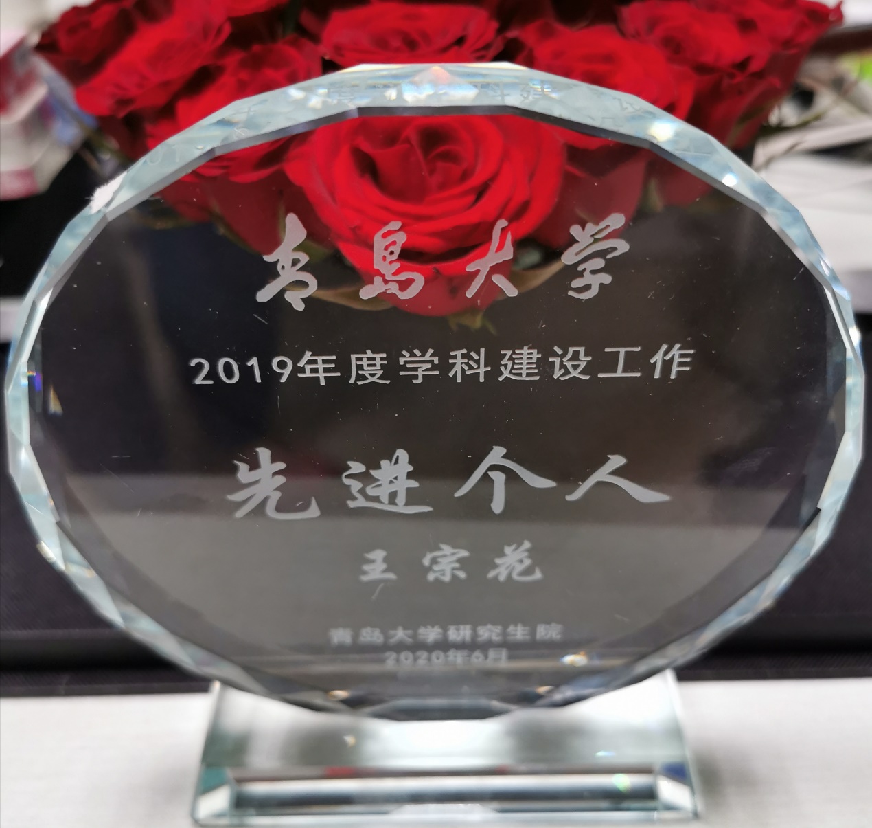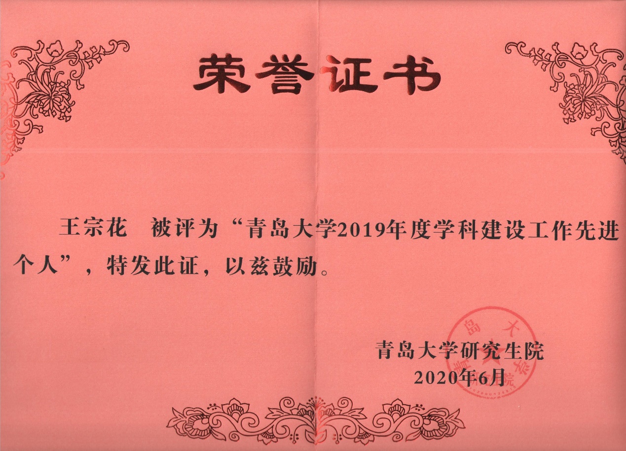 注册送彩金白菜 化学学科负责人王宗花教授荣获“青岛大学2019年度学科建设工作先进个人”荣誉称号