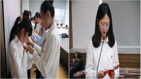 随后,伴随着交响乐《红旗颂》,院学生各党支部书记、正式党员代表为毕业生预备党员发放党章、佩戴党徽。党章捧在手上,就是一种责任;党徽戴在胸前,便是一种使命。“发放党章,佩戴党徽”不仅是一项庄严的仪式,更是一种精神的传承,有效强化了毕业生党员的荣誉感和使命感。毕业生党员代表王晓梅领读党章相关内容,带领大家共同学习党的性质、党员的权利义务等。作为毕业生党员代表,她表示,作为新时代的中国青年,要勇于担当、敢于作为,增强做中国人的志气、骨气、底气,为实现中华民族伟大复兴贡献一份力量!请党放心,强国有我,愿以吾辈之青春,捍卫盛世之中华!此生无悔入华夏,来生愿在种花家!