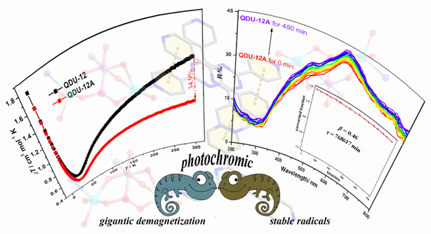 王国明教授课题组在《中国科学:化学》(SCIENCE CHINA Chemistry)发表题为“Optically Actuating Ultra-Stable Radicals in a Large π-Conjugated LigandConstructed Photochromic Complex”(//engine.scichina.com/doi/10.1007/s11426-020-9891-4)的研究论文。通过设计制备出π共轭配体构筑的光致变色材料,利用对位阻效应及分子间π-π堆积作用的调控,实现超分子结构中的光生自由基长达18个月的稳定存在;并对Cu(II)离子和自由基间的反铁磁耦合调控,实现了光致变色体系最大的室温光退磁效应。这项工作对构建并稳定自由基研究提供了新思路,将有力推动光电操控材料领域的发展。论文第一作者为青年教师胡继祥和硕士生姜晓帆(共同一作),王国明教授为论文通讯作者。该研究工作得到国家自然科学基金与山东省重点研发计划等的资助。
