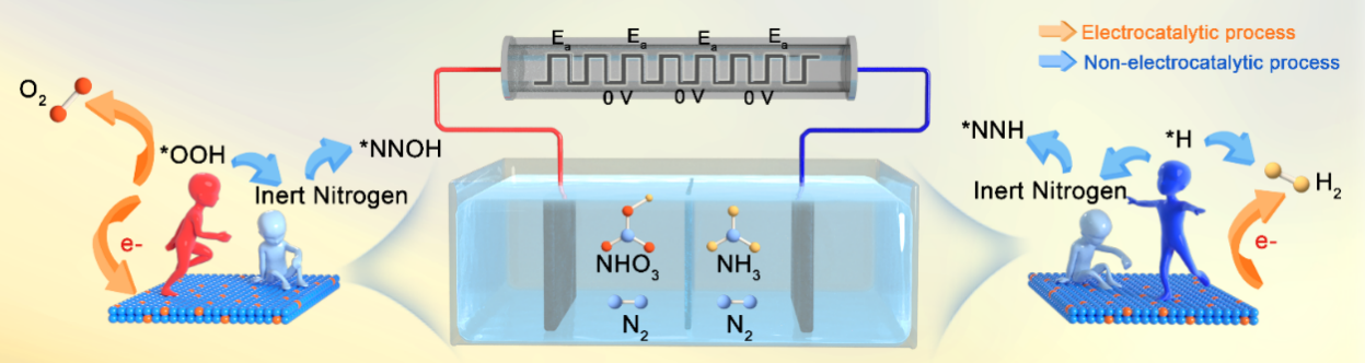 电化学催化氮气固定合成氨和硝酸,被认为是有可能取代传统Haber-Bosch和Ostwald工艺的新技术。然而,固氮反应和水裂解副反应间的动力学差异导致催化选择性低、活性差,如何实现高选择性氮气定向转化一直是阻碍该领域发展的重大挑战。该工作首次将氮气活化理论分为水裂解生成活性氢、活性氧的电化学过程和活性中间体与氮气作用的非电化学过程,并基于反应特点差异,开创性的将非连续的脉冲电催化应用于电催化固氮领域:通过周期性的脉冲策略周期性更新能斯特扩散层活性物质浓度,增强氮气和活性中间体的供应;缓解复杂电化学反应中各基元反应间的动力学差异,实现二电极体系的高效氮气还原氧化(NOR选择性提升44.94倍,NRR选择性提升7.8倍)。该工作为动力学差异的多步耦合反应的电催化过程传质优化、选择性提升提供了新的研究思路。
