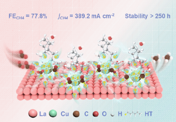 大规模电化学CO2甲烷化是实现碳中和极具前景的途径之一。构建高效且稳定的催化位点对于实现CO2向CH4的转化至关重要。在此,我们设计了一种负载于氧化镧(La2O3)并经己硫醇(HT)分子功能化的含氧铜团簇催化剂(HT@O-Cuc/La2O3),该催化剂实现了77.8%的甲烷法拉第效率(FECH4)和389.2 mA cm-2的分电流密度,并在长达250小时的运行过程中表现出优异的稳定性。硫醇配体通过S原子配位修饰于O-Cuc与La2O3的界面,促进了La与Cu位点之间的电子转移,并建立起一个稳定的电子补充通道,从而在电催化过程中持续稳定低配位的Cuδ+(0.4 < δ < 0.5)活性态。机理研究表明,配体修饰优化了Cu位点对*CO的吸附,并引导*CHO的加氢路径向*CH2OH转变,电子通道效应增强了Cu-C键能,有利于*OH的解吸。同时,La介导的水活化为反应提供了大量质子,推动了*CH2–*CH3–*CH4的定向氢化过程,从而实现了高选择性的CH4生成。